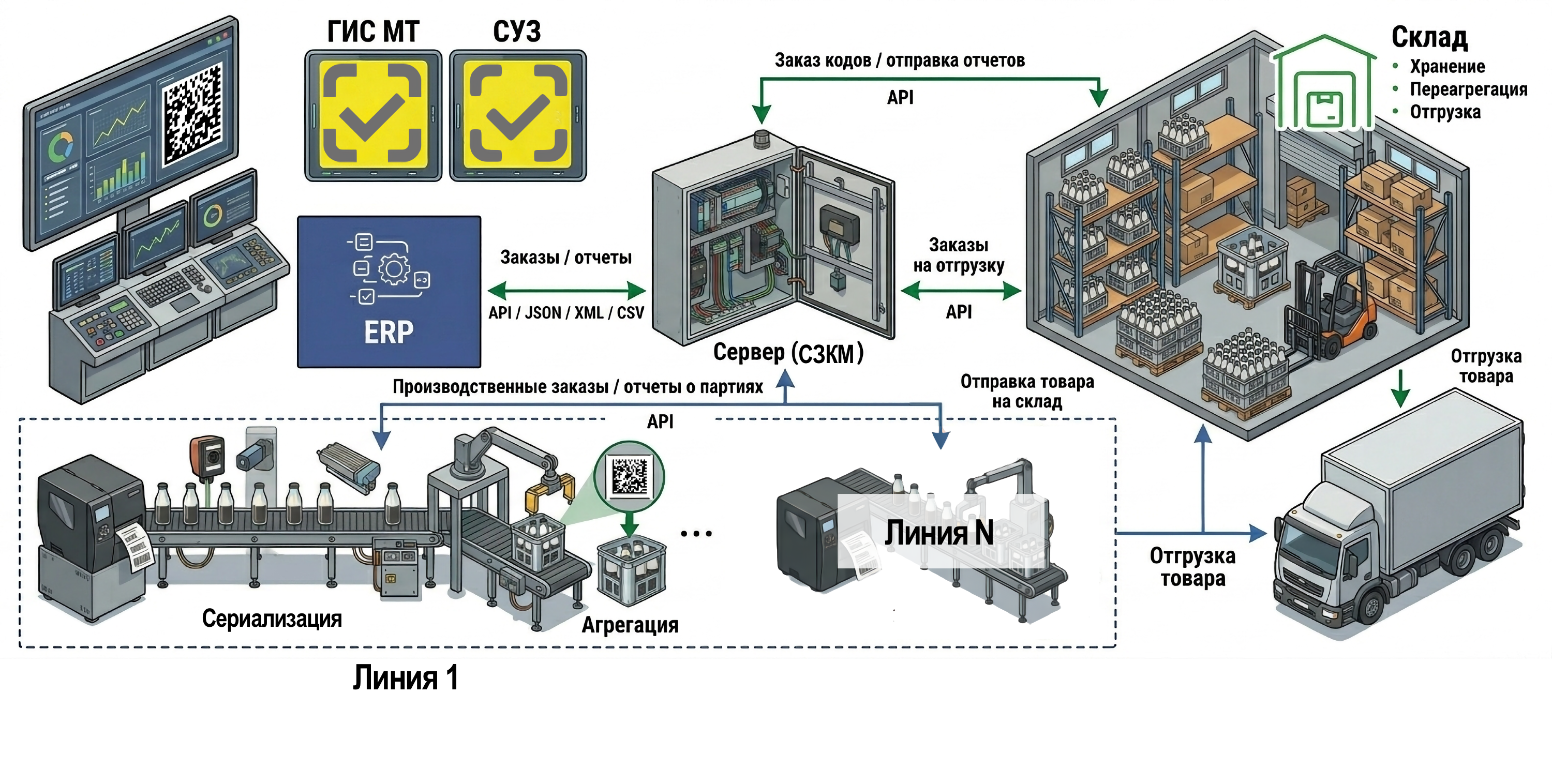 МаркСофт - обеспечивает взаимодействие с ЦРПТ, ERP системой заказчика, системой АСПУ на линиях.
